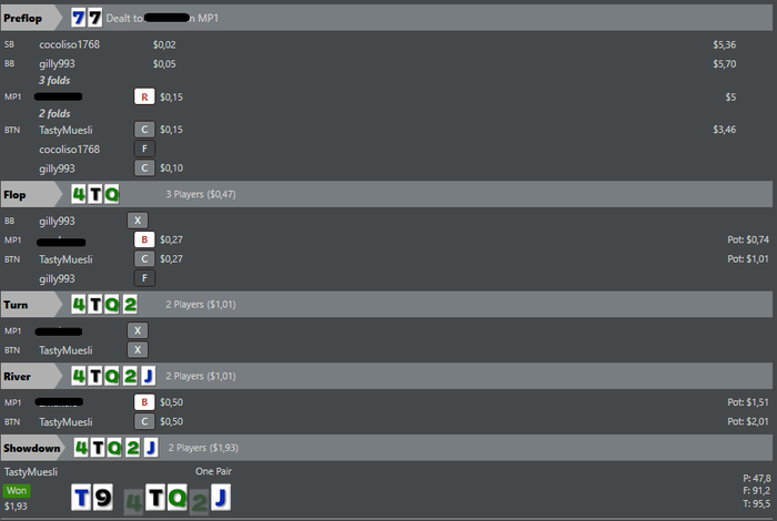 200 рук - задача выполнена, профит +4,10$, удачно заколлировал небольшой 4-бет от рега со своими ДД и поймал на флопе сет, его тузы проплатили полный стек.