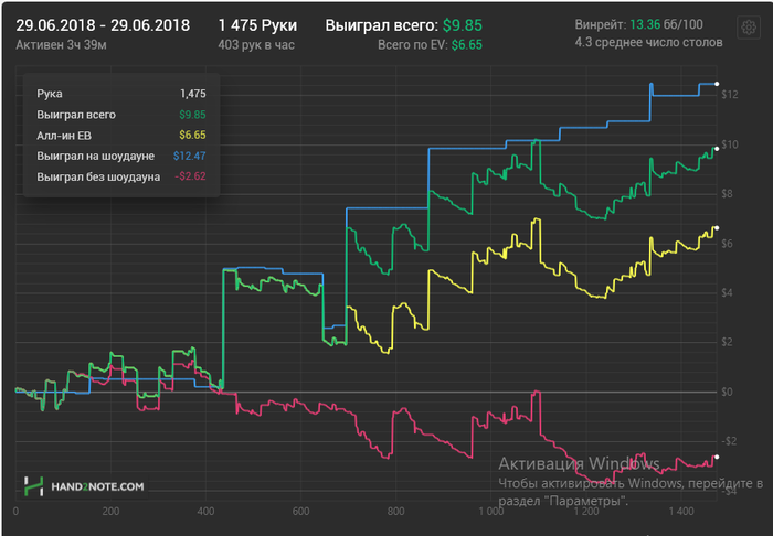В покере иду маленькими шагами к большому результату, за сегодня было отыграно 1475 рук в +$9,85. Уже адаптировался к hand2note и скажу честно, данный софт ничуть не уступает холдем менеджеру.