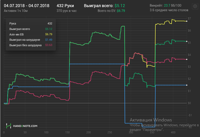 Пробыв сегодня пол дня на работе, еще несколько часов потратив на выяснения отношений с начальством я отыграл всего 432 рук в +$5.12