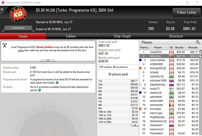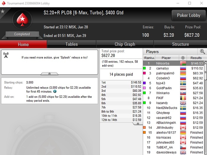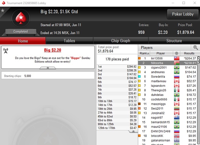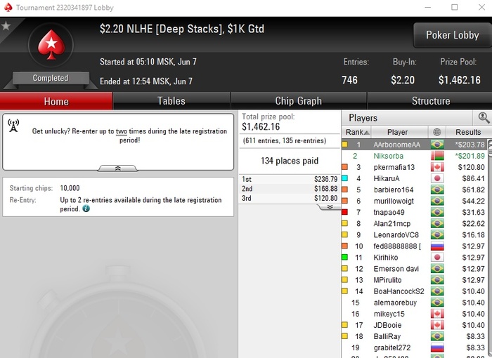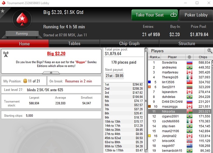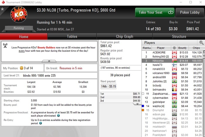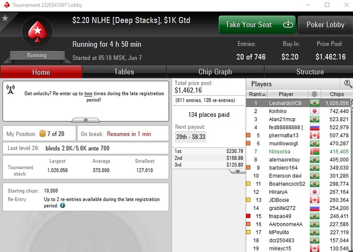 Сейчас крайне мало играю, стараюсь утром загружать турниры, наверное не больше 7-8 туриков удаётся грузить. Один или два дня вообще не играл. Моя футбольная страсть пока берёт верх над желанием играть в картишки.