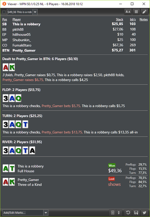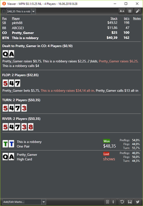 Почему выбрал покеркинг ? У меня о нем странное впечатление. Я отыграл там недели две на 50-100, мне вообще дурдомом показалось. За столом сидит по 2 рега, играющих с нл50 по нл600-1к (добавляют столы для гонки), пара ботов, и, дай Бог, какой-нибудь бедолага типа 28/18, да и тот с выигрышем на ШД 50+. Можно населектить 2-4 стола таких активных, остальные тупо бото-регодрочево за рейк. Плюсануть в таких составах не получилось особо, профит туда-сюда (правда и раздавали таксе). В гонку попал и на красное пару раз поставил - с минимальным плюсом вывел свой депозит. Если элит набить, плюс аффилейт, можно зарабатывать, но это уже какой-то другой покер. Мне показалось, что есть более подходящие варианты для игры. Хотя может я там слишком мало отыграл.