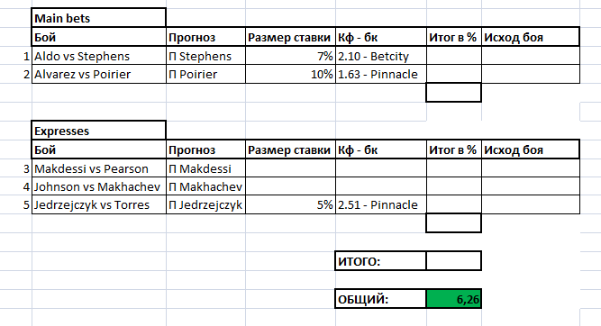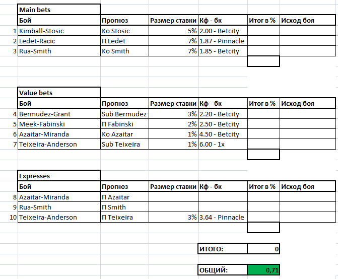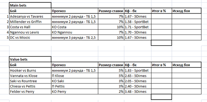 UFN on FOX30 в воскресенье! А я уехал отдыхать на природу! Пропущу взвешивания, пропущу бои, вернусь только вечером. Поэтому заиграем только 3 ставки, в которых я более ли менее уверен.