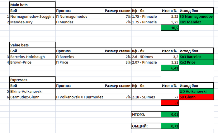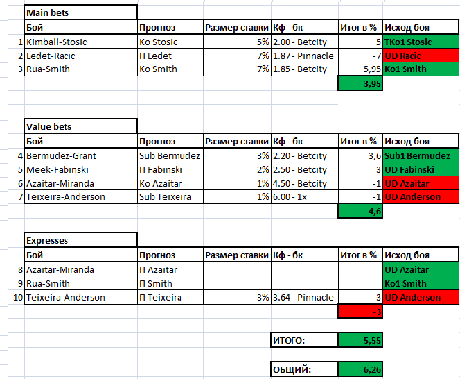 Турнир крутой. Несмотря на то, что последний три боя свели на нет почти весь плюс, я все равно очень довлен. Я рад за DC. Подсчитал свою личную статистику на бои тяжеловесов за последние 2 года, 6+ и 9-. Тяжелый вес слишком дисперсионен… все решить может один удар в любой момент. Решил я, не ставить на тяжеловесов. Возможно и буду, но в исключительных случаях и только на андердогов… и на Кормье)