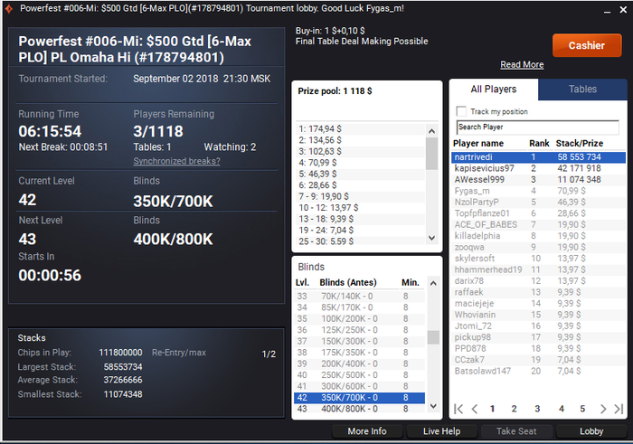 Когда нас осталось троё, я был чипаком около 50бб, следом шел словак - 35бб, и наш соотечественник около 20бб. Все нажимают на делёжку, начинается обсуждение. За первое изначально давали 142$, а по дележке я бы получил 122. Ну думаю, ладно, сейчас словек начнет агрится пихать куждую руку и не будет у меня 2 места, за которое давали 90, а по дележке около 100. Третье не помню, но тоже плюс был около 15-20$. Мы с русским соглашаемся, словак нет. Пишет в чат sorry, но типа, если было бы 6 человек, я бы поделил, но если 3, то нет. Мы поржали и продолжили играть. Далее мне раздают двух сильных двумастных тузов, мы с ним выставляемся и он ловит сет дам на флопе. Обидно. У меня 25 бб, у словака 55бб. Он радуется. Но, потом ему дико не складывалось из-за неумения играть постфлоп.