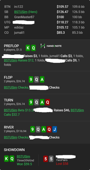 Эти дни катал сессии по 6ч и банально стало скучно , можно сказать сыграл для поднятия настроения . По раздаче все просто , трибет был не на фолд эквити , был план выбить тебя 2умя барелями постфлоп но на терне пришли дравишки и пришлось чекнуть , а на ривере у меня был только такой вариант т,к по такой линии у меня и в правду в процентах 90 случаев будет валет