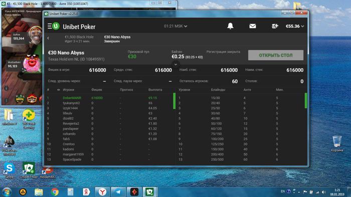 Вчера после очень нервной для меня Лиги Европы решил отвлечь себя на покерных столах ))) ( хотя это спорно) . Зашел на UNIBET открыл По омахе стандартный Калипсо 30EU за 0,65 но там как всегда в последних стадиях здуваюсь занял только 7 место. И также был зареган в ежедневном BLACK HOLE 150Eu за 0,50. "Шатало" тут не по детски сначала набил не плохой стек ну а потом пару переездов в которых сам был виноват спустился чуть ли не до вылета. Потом наоборот выиграл 3 выставления и вернулся на "дистанцию" ).. На финалке играл очень даже не плохо и в хедзап попал уже в 3 часа ночи. Усталость зверская и зная что вставать на работу в 6,30 ну просто уничтожало. Но решил что такого у меня на данном руме не было Холодный душ и в бой. Играл хедзап с игроком SICARIO01 около 45 минут и это было жесть. Оппонент играл если на финалке мне показалось сильно нитово но в хедзапе он явно меня в начале делал, потом одно выставление которое дало возможность получить большую часть фишек и в конце нашей дуэли выставился с AJ и попал в его "снеговиков"88 но тут фортуна мне положила на флопе вальта.