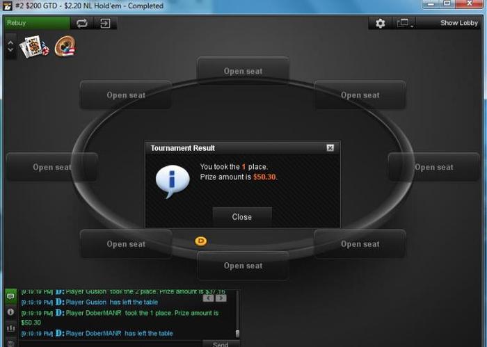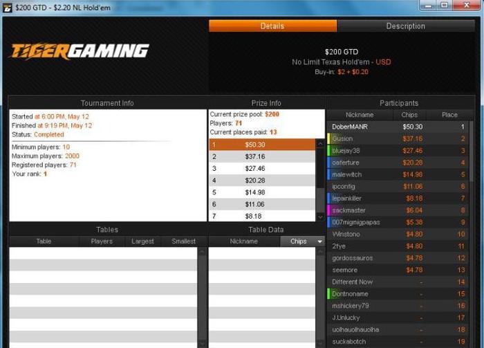 Вообщем " подздулся" я с 37 до 29$ ( сегодня СНГ играем 1-1.50 ). Ну и зашел на Tigergaming на 2.20 и увидел , что здесь народа не много из за гарантии всего 200$ (71 игрок) и правда не без реентри но зашел на финальный стол на 7-ом месте. Подумал что мало и решил побороться. Результат 1 место и + 50$