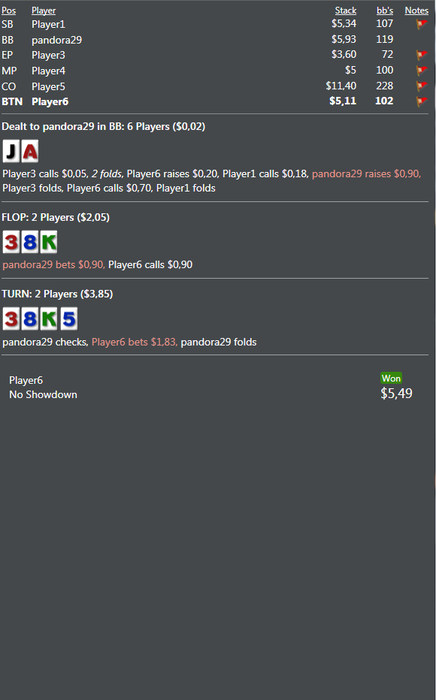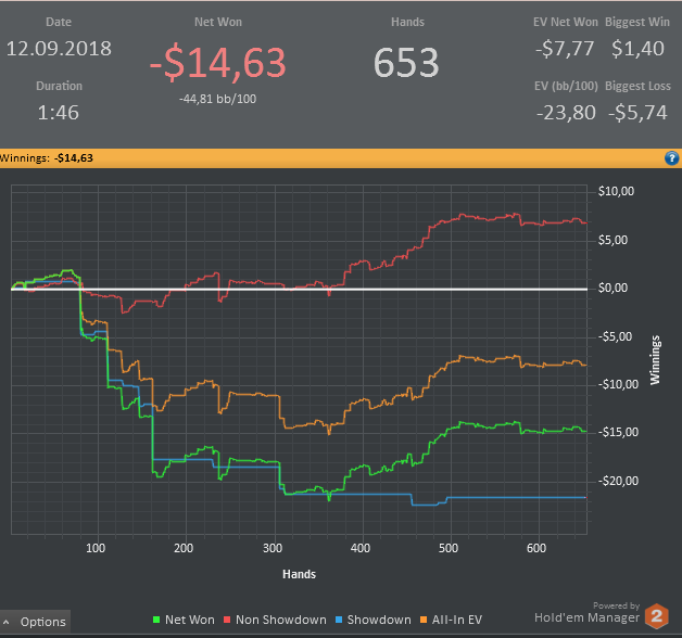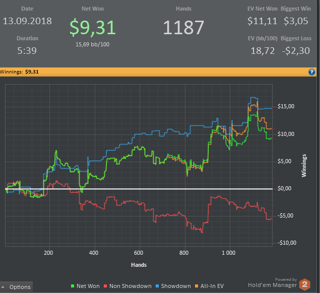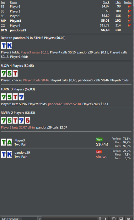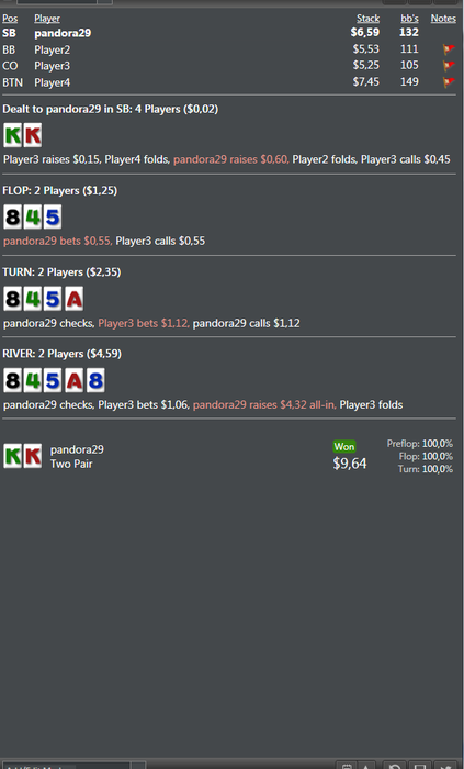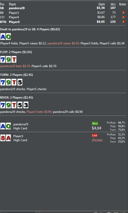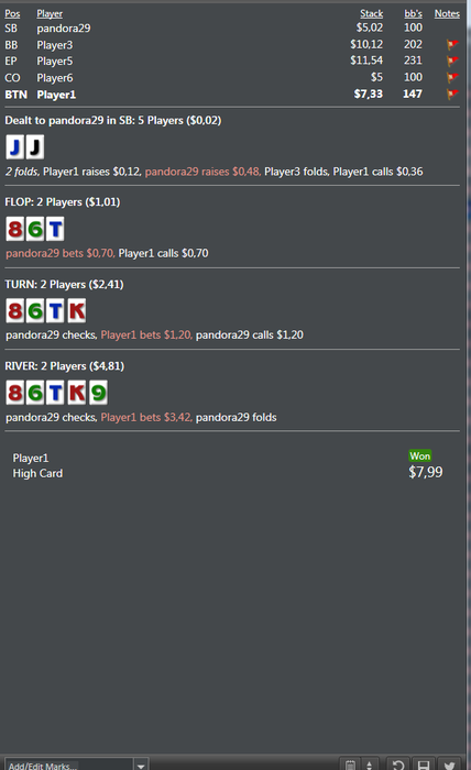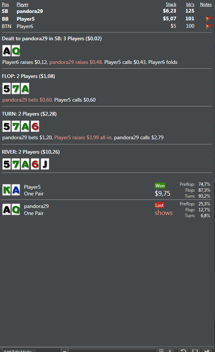Повезло с аутами - пришел туз Терн еще коллируем, но ривер снова околонулевой колл на мой взгляд Смотрим по оппу - любит блефануть ривером - значит колл, если нет - фолд
