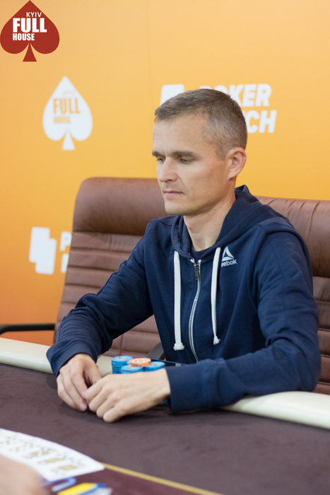 #HighrollerEvent Игроки ушли на перерыв, перед которым состоялась увлекательная раздача. Саша Трофименко с UTG сделал рейз 14К и получил два колла от блайндов. На флопе все прочекали. На терне вышла . Андреев Андрей чек, Влад Коваленко чек, Саша поставил 13К, получил колл от Андрея и рейз до 40К от Влада. Саша сдался, Андрей уравнял. На ривере вышла и в ответ на чек оппонента Влад поставил 80К. В ответ пас и крупный банк уходит на третий бокс.