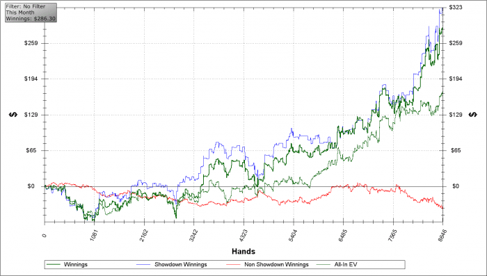 Попытаемся оживить дневничок :). Покерное: Очень рад, что получилось отойти от катки на такой большой промежуток времени. Хотел начать играть с 1 декабря, но дела плавно отодвинули эту дату до субботы 4-го. А дальше я весь день вспоминал, как играть на НЛ10, по старой мышечной памяти делал хироколлы в пот на терне (идем за флешом, епыть!), 4беты оллин на карманках 22-55 и прочий творческий покер, подсмотренный у Двана и ко. Я пертый фиш, апстрик детектед, ГСЧ онгейма возвращает блудных сынов :) В начале графика первые 4к рук видно, как я вспоминал что делать НЛ10. Потом пошел НЛ20, в самом конце НЛ50.