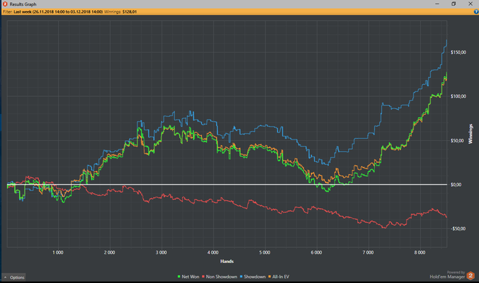 Закончил читать на этой неделе "Относитесь к покеру, как к бизнесу" Дасти Шмидта, крайне практичный взгляд на покер у человека. Почерпнул у него идею не смотреть на результаты во время катки ( знаю что давно стоило так делать, и даже одно время так и было, но я все равно смотрел на результат между сессиями). На этот раз попробовал не смотреть на результаты до конца дня и это действительно очень сильно помогает сосредоточиться на самой катке. До этого каждый обидный переезд мониторил в ХМ-е и расстраивался всякий раз. От этого и эти долгие сессии с попытками отмазаться. Причем зачастую получалось (хоть когда не получалось, то мазался крепко), но всякий раз убеждался, что покер это все же марафон, а не спринт. И всякая долгая сессия по 8-12 часов сбивает как режим, так и рушит планы на жизнь помимо покера. Думаю попробовать следующую неделю не смотреть результат вообще, уберу из вкладки overall и session by day результаты игры и буду лишь ориентироваться на статы.