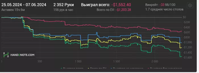 Сорян задержался со второй неделей, но я пока борюсь с ветряными мельницами. Абсолютно ничего не могу выиграть, полную грязь раздают на верхних лимитах и против регов, и против лютых фишей. Такой апатии и нежелания катать не было никогда. Но я стараюсь хоть по чуть чуть. Спустился с сотки, так как она уже не по БР, так чисто один стол в надежде на джек, но обычно за рук 100 проиграешь 1.5-2БИ в грязных кулерах и все.