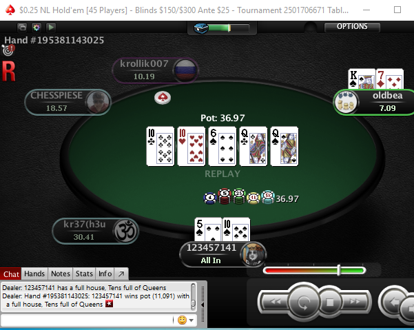 lexalol, реги на 0.25$ понятие относительное. Иногда такое мувят. Пересекались с тобой на финалке, когда мне туз на ривере доехал У меня AQ было, у тебя 75. Еще писал потом, что AQ надо в пуш отправлять, но не всегда. В целях эксплойта лучше колл сыграть, сохранив шансы остаться в турнире, и не получить выставление 50 на 50,60 на 40. Кстати не думал увидеть у тебя 75,думал флоат на флопе, а потом на чек на тёрне запихну, так как часто буду впереди твоего диапазона чека на тёрне. Но увидел 75,ну а ты увидел доехавшего туза на ривере Весело было.