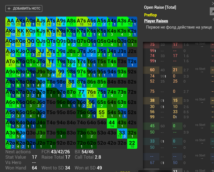 NooB, ,( а зацепившись за мелочь какую идут до конца ) на таких овощах мы и зарабатываем) уверяю им не всегда доезжает) А на счёт того , что рука не заходит ты не прав, они заходят , не играть же токо АА ККQQ:bwahaha:) нужно просто правильно их разыгрывать ) я в некоторых оппонентов J3o и другую дичь пуляю ( важно знать когда именно нужно это делать) Вот зацени статистику опен рейзов , лимпов) и охуевай