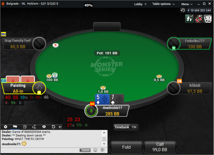Сижу я такой играю самую обычную ночную сессию мне раздают заурядные 33 и тут произошло нечто: наверное он на секунду подумал,что решил покер и захотел выбить мои дро и слабые пары,но блять не фартануло братишке )Увидев мой сет его жопа не выдержала и сразу же я был послан нахуй на забугорных языках и парень на дизморали пошел пушить каждую руку.Я такого же и на нл10 встречал,только тот игрок видимо был богат и по фану пушил нас,а этот прям подгорел)Если честно раньше мне тоже казалось из за таких "переездов",что мне не везет (в самом низу картинка с этим типом и чат,как он бесится,потому что я "переехал" его своим ) вообще я всегда смакую такие моменты)