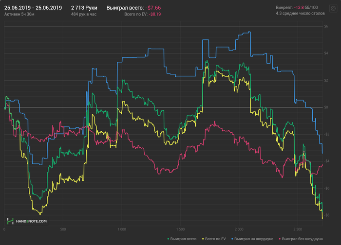 Вчера решил между сессиями позаниматься "зарядкой" приседать там отжиматься и т.д.До этого я год занимался с тренером в тренажерном зале и был в очень хорошей форме,но в какой то момент закончились деньги и пришлось временно завязать. Бездействие длится уже год и мои мышцы атрофировались,поэтому после вчерашней "зарядки" проснулся разбитым и еле еле заставил себя играть. Сегодня карты раздавали очень плохо,еще и интернет вылетал 3-4 раза. Когда играешь продолжительные сессии кажется,что большинство действий-рутина и ты просто чилишь и за час принимаешь 1-2 судьбоносных решения,но оказывается,что каждый вылет в любой момент времени критичный. Вот один из них: Влияли ли вылеты на мое эмоциональное состояние? -да Раздавали ли сегодня такие карты,что мне суждено было минусовать? -да Играл ли я в свой лучший покер? -нет Хотелось ли мне беситься и бить по столу? -да Бесился ли я? -нет Еще я поймал себя на мысли,что мне стыдно выложить минусовый график нл2. Именно поэтому я его и выкладываю. Мое ЧСВ не позволит мне идти сейчас отдыхать,я хладнокровен и готов продолжить игру. Сессия еще не закончена и я выведу её в плюс своими решениями.Я ничем не лучше людей,которые играют на нл2,хотя внутри себя я говорю обратное и ставлю себя выше ,но на самом деле я нахожусь на дне пищевой цепочки покера,тупой и слабый.Но я исправлю это.
