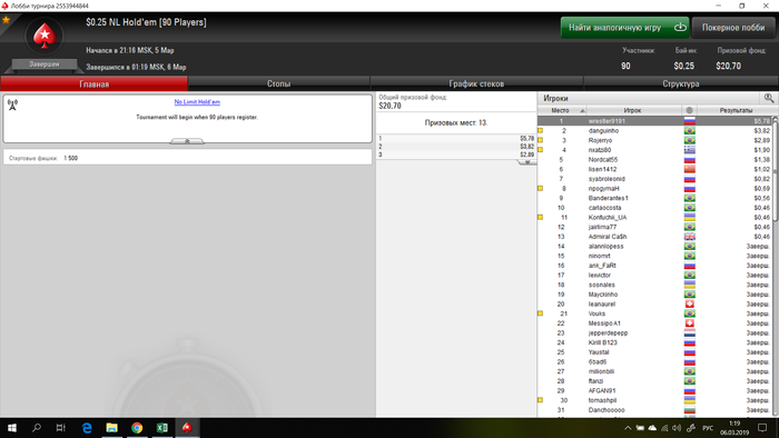 EvilG, ды не сказать что прям сильно. Из 6 туриков 1 на последнем призовом. В одном вылетел прямо на бабле СБ в бб, запушил ДД, и меня заколили ДВо и естественно ему трипс валетов прям на флопе пришел. Очень бешусь из-за таких переездов((