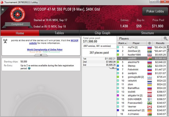 Я ранее исходил из этого оптимистичного расчёта, но мы в нём не учитываем особенность хайлы, а именно то, что в трети случаев произойдёт делёжка, а нок за оппонента мы получаем только в случае скупа... Если скуп, как писалось выше, произойдёт в 25,71% случаев, сделаем более точный расчёт матожидания нашего колла. Если мы скупаем, наш выигрыш составит 3000 фишек оппонента,60 фишек, вложенных нами минрейзом, 50 фишек блайндов и анте и 1500 фишек нокаута оппонента, всего 4610. Если делим, получим +85 фишек, если проигрываем, теряем 2940. Таким, образом, МО=4610*25,71%+85*36,85%-2940*37,44%=1185+31-1101=115. То есть, всего +115 фишек. В 4 раза меньше, чем по оптимистичному расчёту. Как это быстро рассчитать в уме, пока не знаю. Вывод: нокаут-турниры надо играть немного лузовее, чем обычные, если у нас стек больше, но всё равно не очень широко.