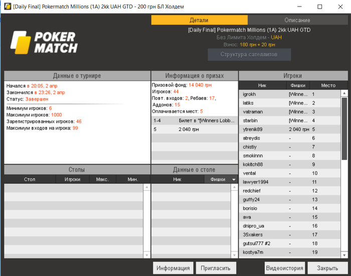В ноябре 2018 года, на серии PokerMatch UA Millions Kyiv чемпионом страны стал Тимур Азизов А в феврале 2019 года, в Харькове на PokerMatch UA Millions Stadium этот турнир покорился Денису Крыгину. Посмотрим, кто станет чемпионом Украины в мае!