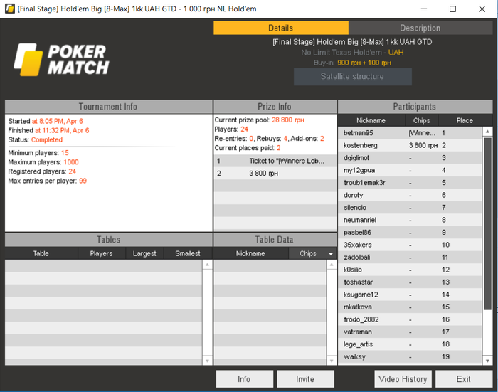 Отобраться в чемпионат можно в онлайн-сателлитах на PokerMatch, которые стартуют с фрироллов. А первый финальный отборочный турнир пройдет на PokerMatch уже в ближайшее воскресенье, 7 апреля (начало в 20:05). Бай-ин — 200 гривен. Гарантия — 10 билетов!