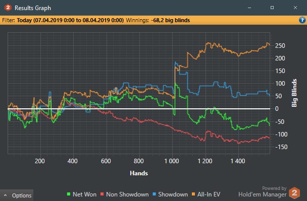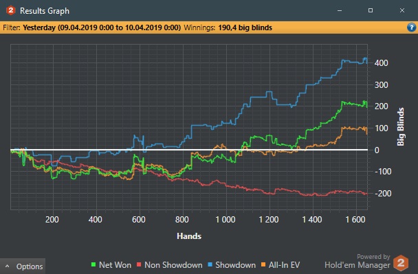 А тем временем вчера возможности покатать не было, только сегодня. Сыграл 20 туриков, игра шла неплохо в целом, только вот важные алыны совсем не тащились. На графике будет видно.. Сегодня крайняя степень несчастливых выставлений) Тем временем кол-во рук приближается к отметке 10к, я решил как наиграю это кол-во - уделю вечер непосредственно разбору туриков и работе над игрой в целом. Т.е. уже примерно через сессию. А то пора уже с майзера пыль сдувать