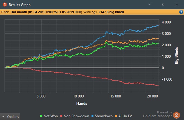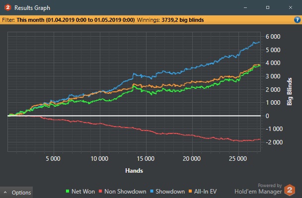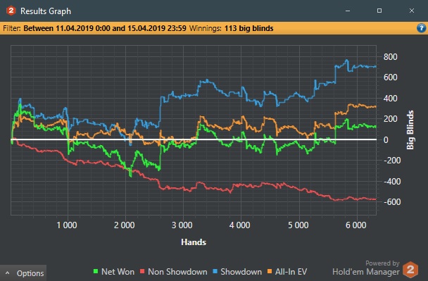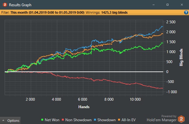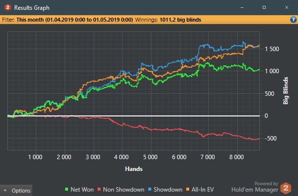 1. Отыграть минимум 300 турниров. 95/300 (кол-во рук: 8756) 2. Провести работу в ХМ2 над базой рук, а также отработать в айсимайзере/эквилабе - 20 часов. 2/20 3. Уверенно и стабильно катать 8 столов. 6/8 (хотя сегодня играл 8 столов, сильного отличия от игры в 6 не почувствовал, но времени на подумать остается поменьше) 4. В конце месяца иметь минимум 12 евбб/100. 17,9/12