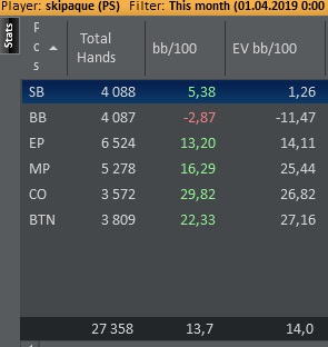 1. Отыграть минимум 300 турниров. 145/300 (кол-во рук: 12078) 2. Провести работу в ХМ2 над базой рук, а также отработать в айсимайзере/эквилабе - 20 часов. 4/20 + 2.5 часа просмотр видео тренировок. 3. Уверенно и стабильно катать 8 столов. 7/8 (всегда держу в загрузке 8 столов, но пока смело писать, что спокойно столько катаю, не могу) 4. В конце месяца иметь минимум 12 евбб/100. 15,6/12