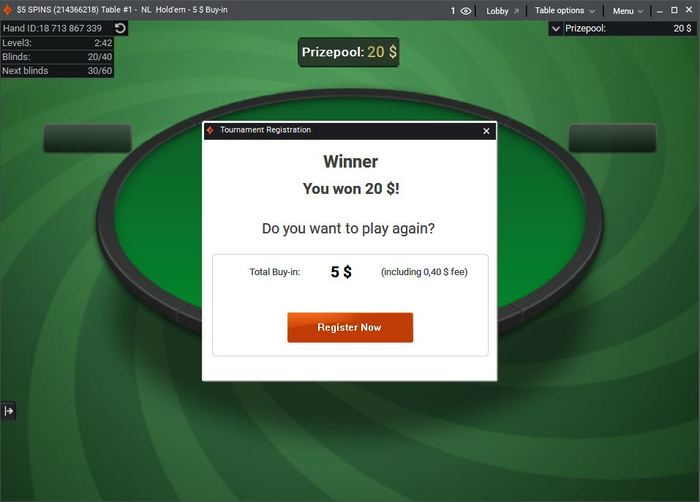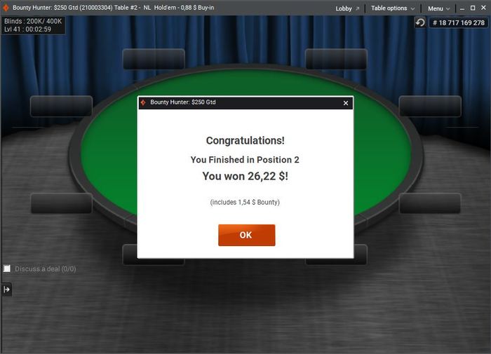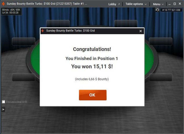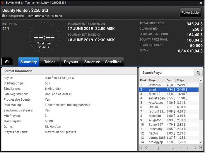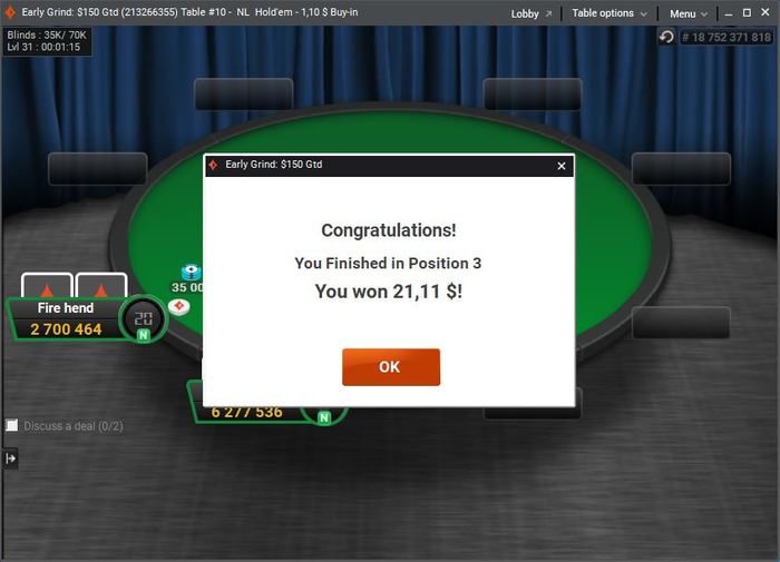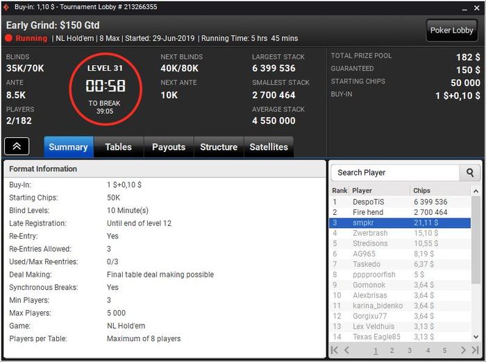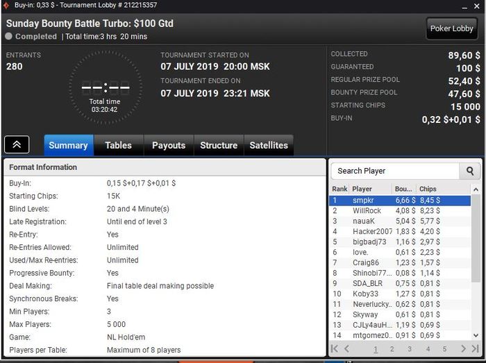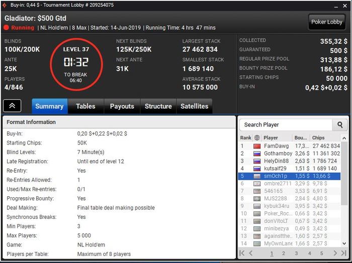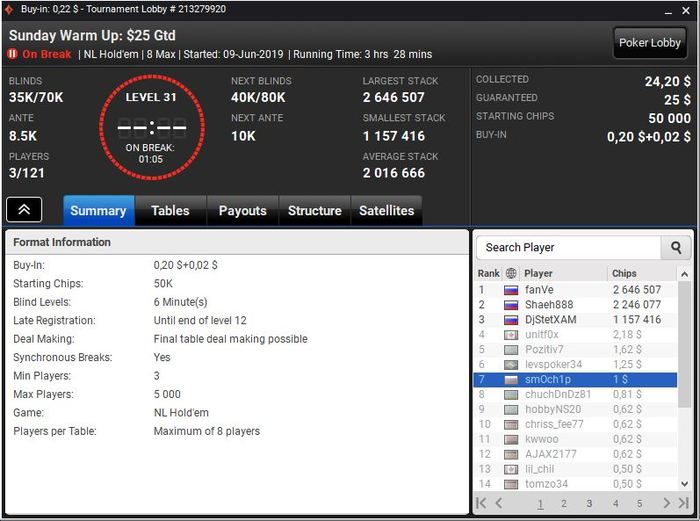 Итог - 7 место в Sunday Warm Up: 25$ gtd и билет на Sunday Gladiator $100K Gtd во фрироле.