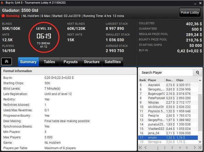 Всем привет! Сегодня загрузил 13 турниров (на 11$ и 5.50$ отобрался через саты). Итог - 7 место в Sunday Warm Up: 25$ gtd и билет на Sunday Gladiator $100K Gtd во фрироле. В нём была килополяна из 5000 человек и 500 билетов, что очень привлекательно.