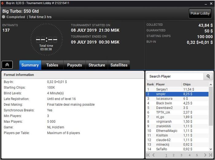 Сегодня загрузил 13 турниров (на 11$ и 5.50$ отобрался через саты).