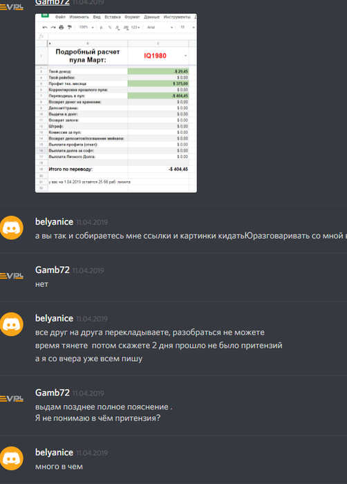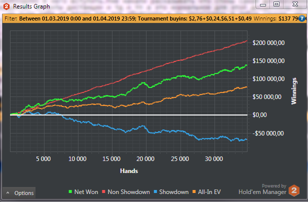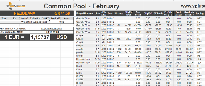 2)Игрок заявляет что пул разводит его на деньги. За март месяц игрок сыграл по EV -67.47$ по факту профита который идёт в пул +337.5$, т.е. его передача составила 404.60$ на которые он и кинул пул
