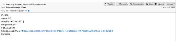 Игрок написал огромный текст. Из текста мы видим 2 претензии: 1)Игрок заявляет что играл в пуле только 3 лимит, а от себя 1 и 7 лимит. Прилагаю скрин письма с почты пула