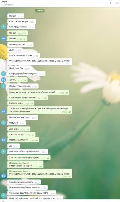 Дальше я стримлю пару дней, жду инфы, жду обещанных плюшек. Кормят завтраками, ничего не делается. Обещали сделать такую мелочь как "оформление твича", но после предоставления данных от моего твичёвского акка Александру #2, у меня на канале тупо убрали партнёрку ГТ в первую же минуту, дабы трафик шёл только на покерОК. Я ждал оформления твича 3дня, 3 дня ничего не было сделано. И по-прежнему 3 дня меня кормили завтраками, и опять не давали абсолютно никакой инфы.