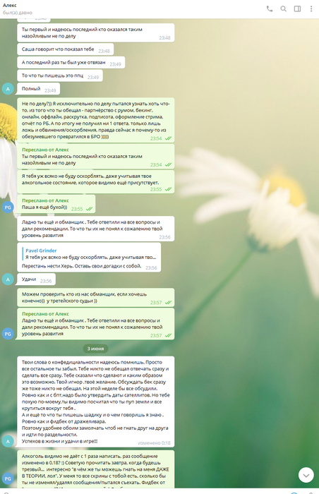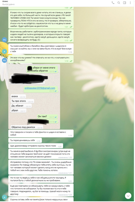 И так Павел "Onlinepoker2019" onlinepoker2019@gmail.com ( мою почту ты спалил кстати). Что мы имеем в сухом остатке : Как оказалось тебя никто не кидал и не собирался этого делать, ты же в свою очередь показал себя мелким склочным человечком (оценочное суждение) вывел на агрессию людей ( в переписке) и выставил "Мошенниками , ОПГ , аферистами, ведь ничего бы этого не было будь ты чуть терпеливие и воспринимай ты информацию которую я тебе давал. Думаю тема исчерпана , но хиро вскоре вернётся с новой темой где его кто то кинул, будьте уверенны все будут аферистами лгунами представителями опг или что еще похуже. Всем спасибо за внимание у меня всё!