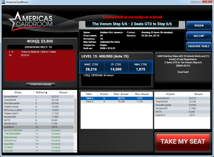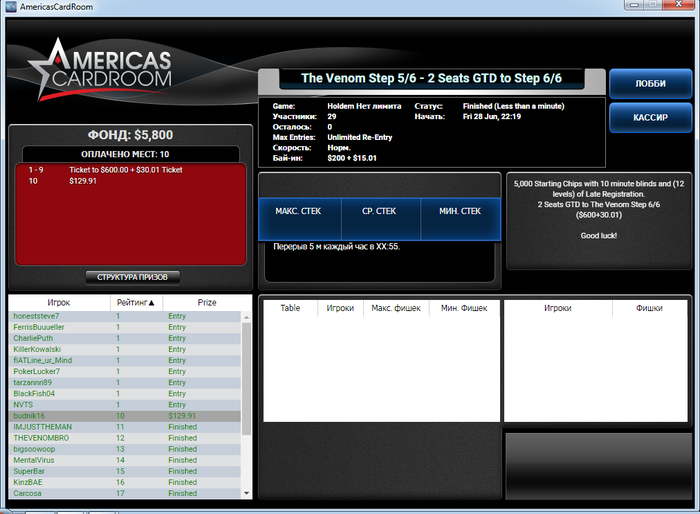 Привет,севодня играли с тобой за одним столом в етих степах)тоже пробую на турнір пробитись...1 раз уже играл по 200 то не сложилось..сечас играю 2 раз то пока так