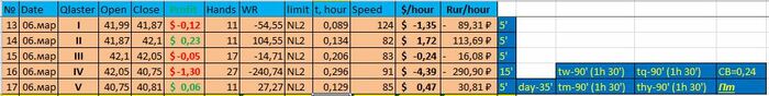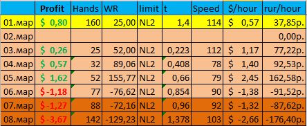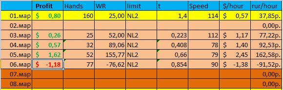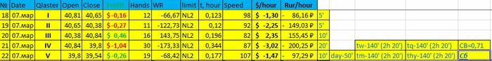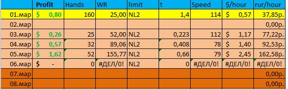 Итак продолжу... Разбил день на 5 сессий по часу, хотя IV из них 2-х часовая будет... основная так сказать. Каждый день наполняю их игровым временем, сегодня наполнил IV сессию на 10 минут (как наполню все сессии, добавлю столы, затем пойду на лимит выше, шажочек за шажочком))). Итог на начало 2612 руб после 2630, итого плюсом 17,35 руб, начало радует 3 марта объём времени 10 минут, дальше больше, пока адаптируюсь)