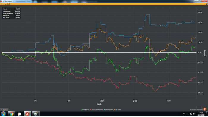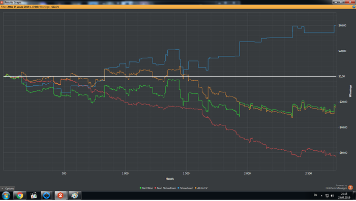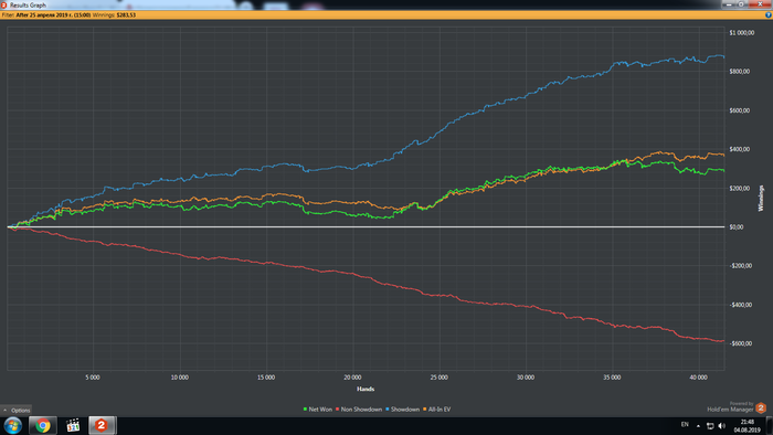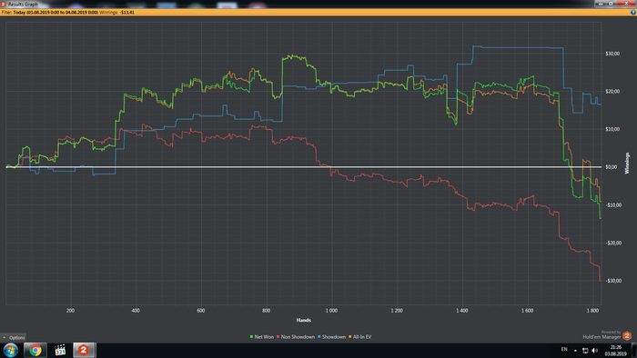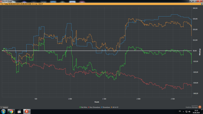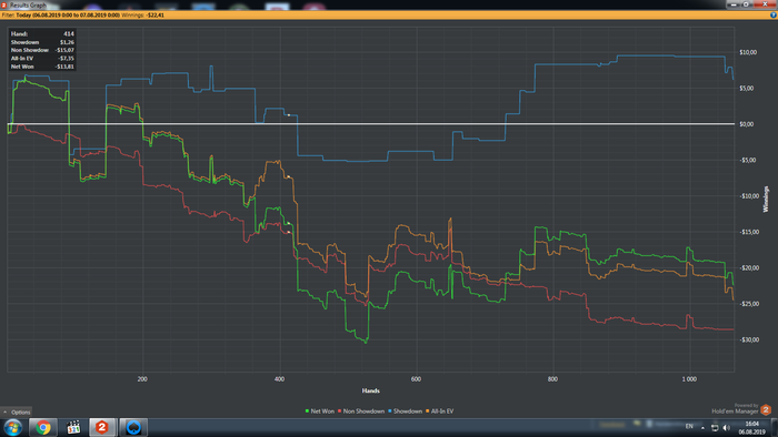 Денек сегодня по результату выдался крайне неудачный. Заметил небольшую закономерность между получением новых духовных знаний и игрой в покер, как только ты выходишь на новый уровень осознания, восприятие мира, как сразу тебе "дарят" небольшой даунстрик. Это своеобразный намек, мол друже ты стал шире в плане энергии и осознания , становись шире и в покерном плане, когда у тебя еще появится желание работать над игрой, кроме времени полного провала и нехватки денег? Жду - не дождусь когда картина неудач в этом месяце ляжет в основу чего то большего, утешая себя неким состоянием предвкушения)