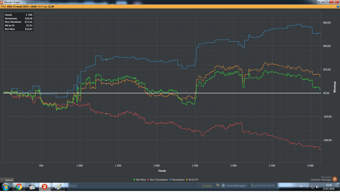 Апчик остался погостить, дает отмазать минусовый месяц. Столкнулся с отсутствием игры на 10нл в 10-30 по мск, было всего 2 стола, что очень печальная тенденция на 888 в последнее время . На нл5 была рег катка, но на лимитах 20-30нл одни фиши за столами... Было очень приятно встретить регуляра за столами, читающего мой блог , kjienlol привет)) В целом стал более уверен в принятии решений, могу объяснить для себя более широко причины принятия определенных действий. В планах на неделе протестировать игру ночью и ранним утром , возможно внести коррекцию в расписание под фишей.