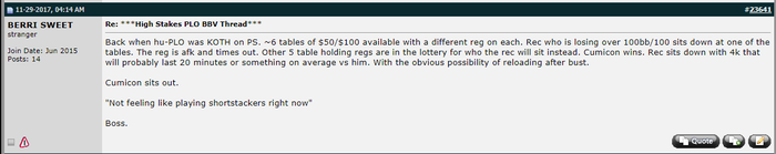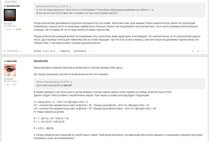 Твоя оценка Шуллера = с точностью до наоборот. В форуме есть достаточно много регов уровня пло500+ . Некоторые из них в режиме рид онли. Некоторые из них полностью ушли в свои блоги типа Гампа или Бомжихи. Причины у всех разные. Кому-то надоело, кто-то не хочет делиться наработками и усиливать поле, кто-то сосредоточился на непокерных вещах. Ну неважно.