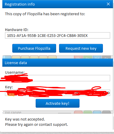 This is key for Flopzilla v1. Нажмите "Request new key" и тд. Нажимаю - перехожу на сайт - заказываю новый ключ - получаю и всё то же самое. "This is key for Flopzilla v1". +100500 раз пробовал и всё по кругу. Не регистрирует. Комп тот же. На сайте в колонке Key nr. (1 or 2): ставил "2". и всё равно присланный ник и пароль не регистрирует.