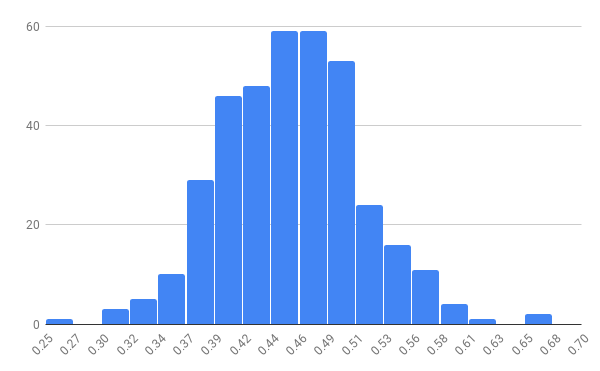 в HM перейди на вкладку Opponents и увидишь сводный отчет по статистике твоего поля включая показатель WTSD. экспортируй отчет в csv и построй гистограмму и глядя на нее поймешь как твой стат выглядит в общей картинке. среднее значение то по любой будет в районе 50% и распределение должно быть нормальное, но важно понять какое там среднеквадратическое отклонение вот примерно такая картинка будет