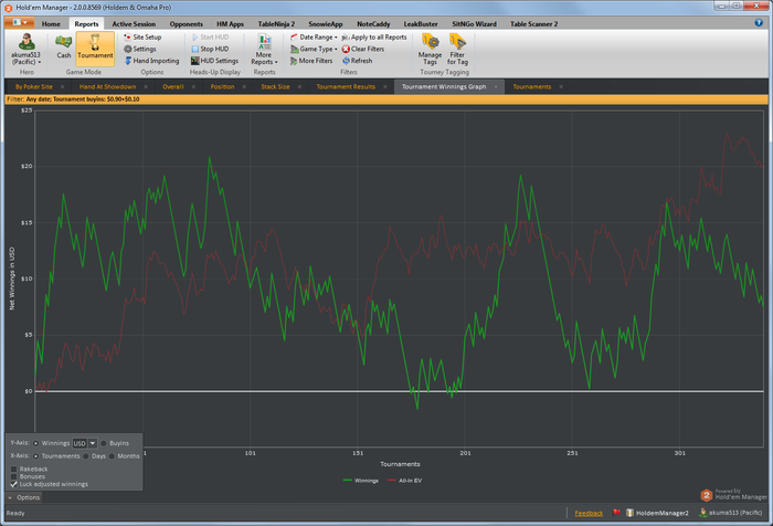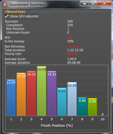 Результаты скромные и по деньгам и по дистанции, очень трудно себя заставить много играть. В среднем получается по 20-25 турниров в день. WTSD на несколько % уменьшился, это хорошо, почему то он всех очень сильно волновал) Общий график. На графике видно, что около 200 турниров сыграл в 0 (некоторые по 5к в ноль играли и ничего. Димону привет ).
