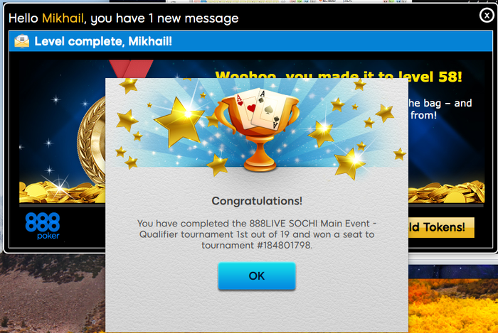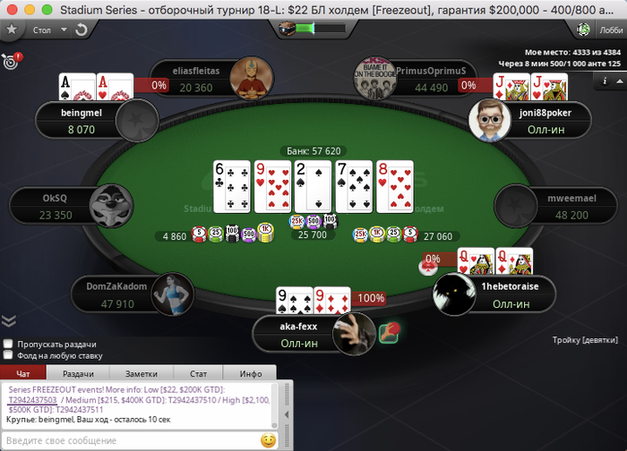 Первый раз в покерной жизни отобрался на оффлайн-турнир через онлайн-сателлит. 888 долларовый тикет на мейн за 5.50.