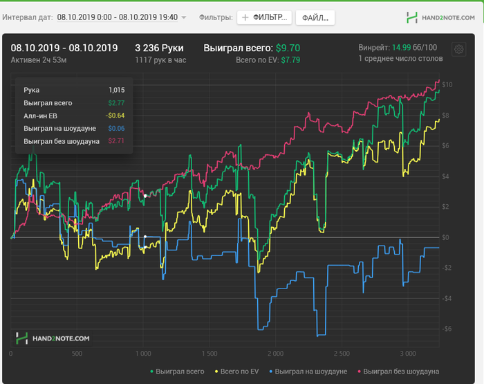 Ну и график сегодняшней первой сессии с новым подходом, если еще и разобраться как играть префлоп и разработать правильные линии своих диапазонов, а не пихать и телефонить налево и направо, то с нл2 можно будет справиться.