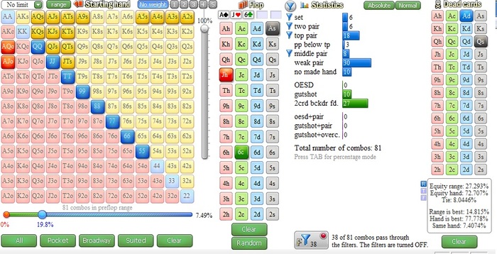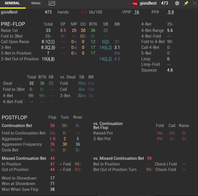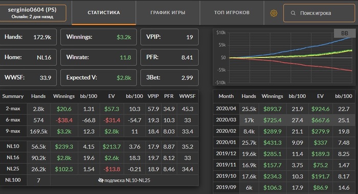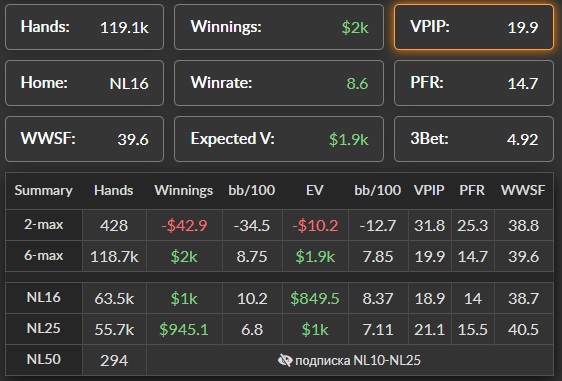 Работа над игрой: Вот мои статы за последние 6 мес (самое печально что я нит с ввсф 40, что отыграл в среднем 20к рук в месяц) И да, я не знаю что такое флопзилла и вообще не работаю над игрой (за исключением разбора раздач во время игры, 4 стола не особо отвлекают, хотя какой там разбор, пробиваю оппа по смартхенду и смотрю результат) Т.е. имею базовые знания с 2012 года и все, ничего более, т.е. если прочитаете мой первый пост до сентября 19 года я последний раз играл в 2012 году и впринципе ничего более не менял, с тренерами не занимался, про флопзиллу только слышал даже не скачивал, не говоря о симпл постфлоп или еще что-то. Поэтому смело можно утверждать, что покер не мертв, раз такой персонаж показывает 7-8 бб/100 на лимите 16\25. У меня даже нету префлоп ренджей (я их беру где-то в голове, но это не точно) Но все-таки хоть какая-то работа ведется, а именно: Смотрю на топов лимита их статы и пытаюсь подстроится, но не так тупо просто повысить статы, главное получить +ev\bb Что сделано за текущий месяц: 1 повысил стил с сб с 33(среднее) до 49 2 Самое главное (где видимо терял много бб\100) кбет ривера, если взять 19 год кбет ривера около 34%(сильно не добирал особенно против фишей, хз почему) Сейчас уже впорядке, даже местами переусердствую..... 3 повысил колдколл с бб до 30, но пока еще не понимаю зачем, наверное 25 вполне достаточно. 4 в какое-то время был высокий фолд на 3бет, около 60, потом увлекся и упал до 40 (сейчас в районе 50 что вполне достаточно)