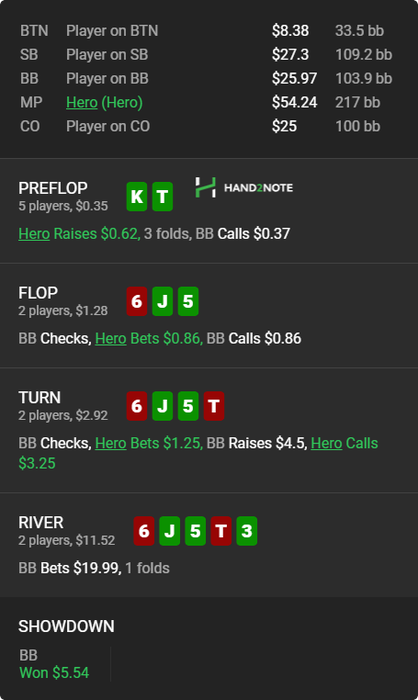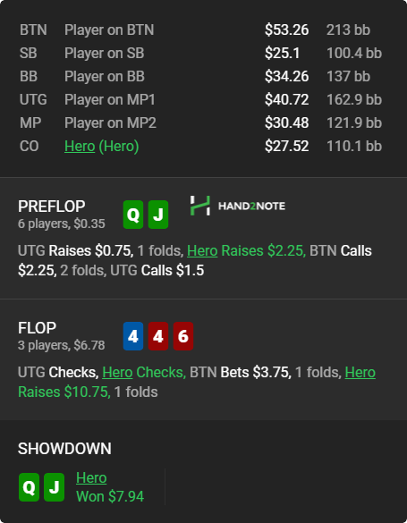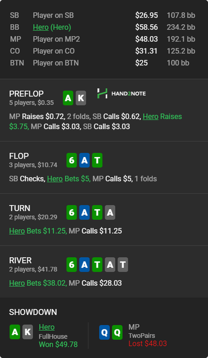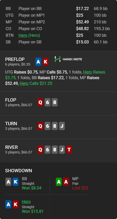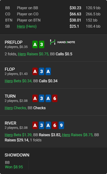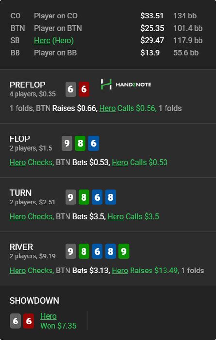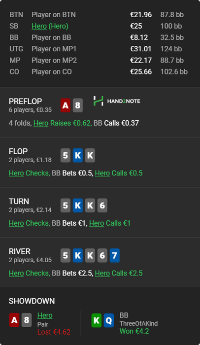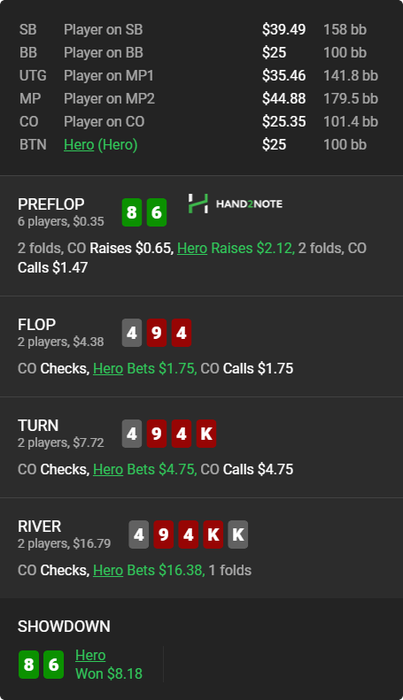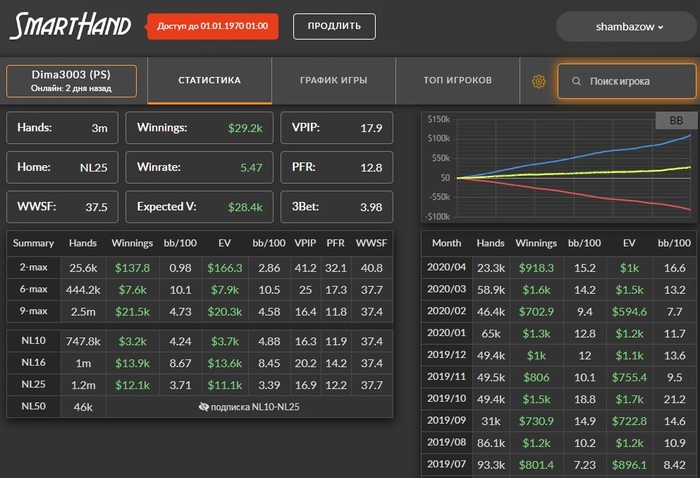 Вообще люблю покопаться в смартхенде и искать разных индивидуумов... Вот например, пацан просто забирает бабки у фишей и ничего не придумывает... понятно выше нл 16 работать такая схема не будет, но все же обидно, когда сидишь че-то думаешь ,а пацан просто в 2 раза больше показывает винрейт ничего не выдумывая...