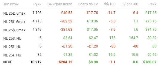 Похоже месяц закрыт. План 30 к рук снова коту под хвост... Впереди отпуск на 2 недели... Из целей 1 Низкий 3бет - 5% повысить хотя бы до 6.5% - не выполнено, но и в дальнейшем делать не собираюсь...(мой кумир Ma1n1 и без этого гребет лопатой) 2 Слабый ч\р флопа 7% - нужно повысить до 9-10% - по месяцу 8.5% - пока чуть лучше... 3 И самое главное увеличить число рук до 30к\ месяц - снова провал((((((((((