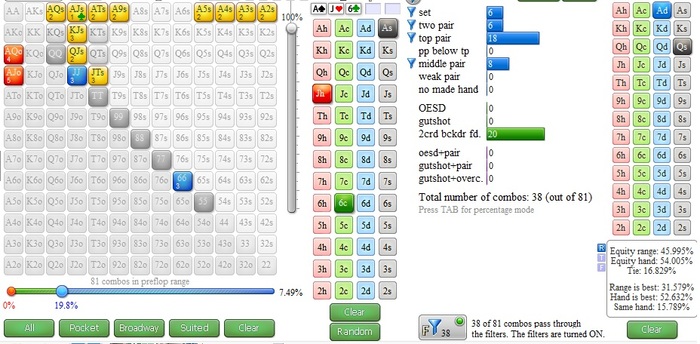 Прокомментируйте. опп чето криво загрузилось опп 19\16 470 рук. по смартхенду 26\20 фолд на 3 бет заниженный 38, хотя тут сквиз. А если у нас АK? как играем. Сейчас смотрю и сайзы по улицам не нравятся, особенно флоп, наверное надо было больше ставить....