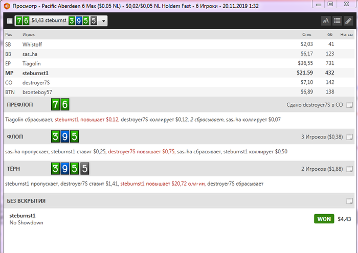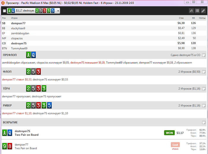 fxparkhomenko7 @ 26.11.2019 Очень интересная раздача была сыграна вчера, был бы это лимит nl25 меня бы бомбонуло, 3бет банк, парень регуляр со статами 23/19/6,7 агрессия 9, как бы вы сыграли, пушили бы ривер или сдались?