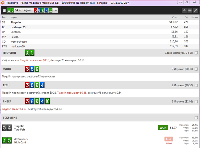Еще одна раздача в которой все указывало на блеф, плюс опп фиш со статами 53/24/25 хотя и рук мало - 18, в таких ситуациях на месте фиша, я не блефую, не пытаюсь выбить А-хай, так как показывает практика, в среднем поле не выбрасывает даже на овербет.
